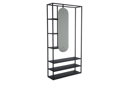 Daugiafunkcinė drabužių kabykla pagaminta iš juodos spalvos metalo.