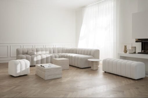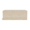 Pagamintas iš travertino akmens, kuris šimtmečius buvo naudojamas klasikinėje architektūroje visame pasaulyje. Natūralus akmuo turi netaisyklingą paviršių su mažomis skylėmis ir trūkumais, pridedant lytėjimo kokybę geometrinei formai. Staliukas primena architektūrinius pastatų fasadus, kad sukurtų vertikalų ir ploną stalo dizainą. Rievėtas natūralaus akmens paviršius suteikia lytėjimo pojūtį, o šešėliai visą dieną keičia akmens paviršiaus gylį ir charakterį.