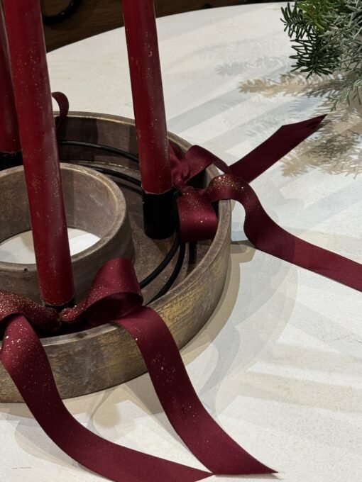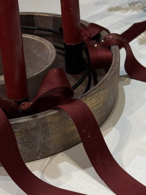 • Dekoras: Žvakidė puošta elegantiškais kaspinais, kurie įneša prabangos ir šventinio žavesio.